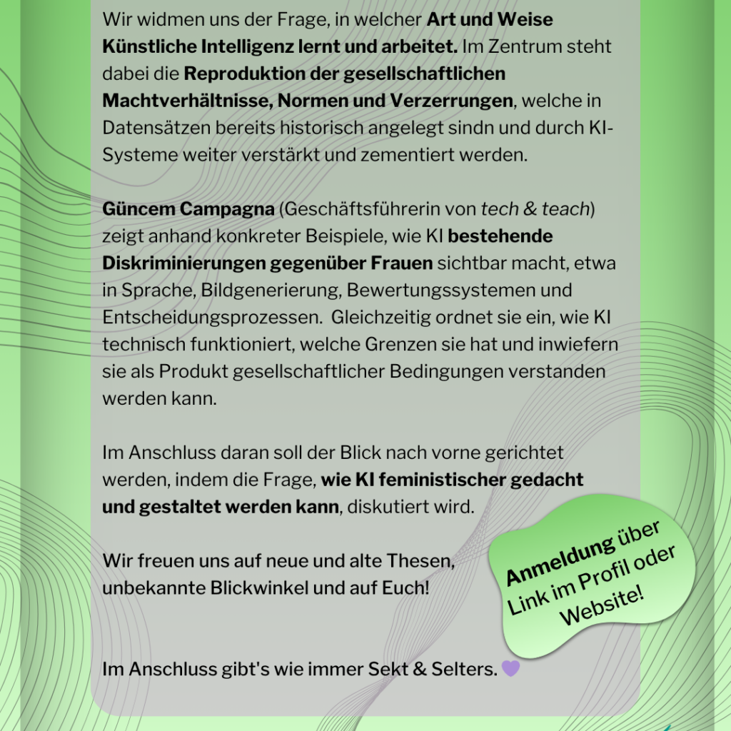 Güncem Campagna, Geschäftsführerin von tech & teach, wird anhand konkreter Beispiele erläutern, wie Künstliche Intelligenz lernt und arbeitet und auf dieser Grundlage bestehende Diskriminierungen gegenüber Frauen sichtbar macht und reproduziert. Gemeinsam wollen wir diskutieren, wie KI feministischer gedacht und gestaltet werden kann.